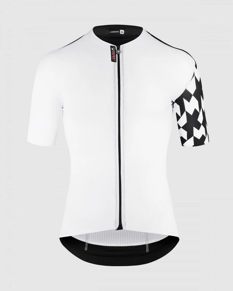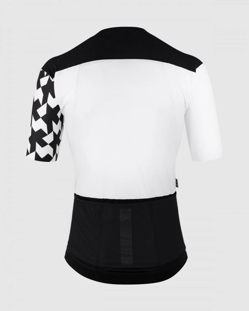 The jersey combines a body of miniCheck Tex—responsible for the signature ASSOS jersey texture—with a Stabilizer insert to anchor the pockets. The blend resists odor while promoting breathability and cooling airflow. Sleeves and pockets of Push Pull warp knit add a breathable, bi-stretch fit that wraps in stabilizing stretch. The textiles provide UPF 25, 30, and 50+ for the front, back, and sleeves, respectively. - CONSTRUCTION/FIT: